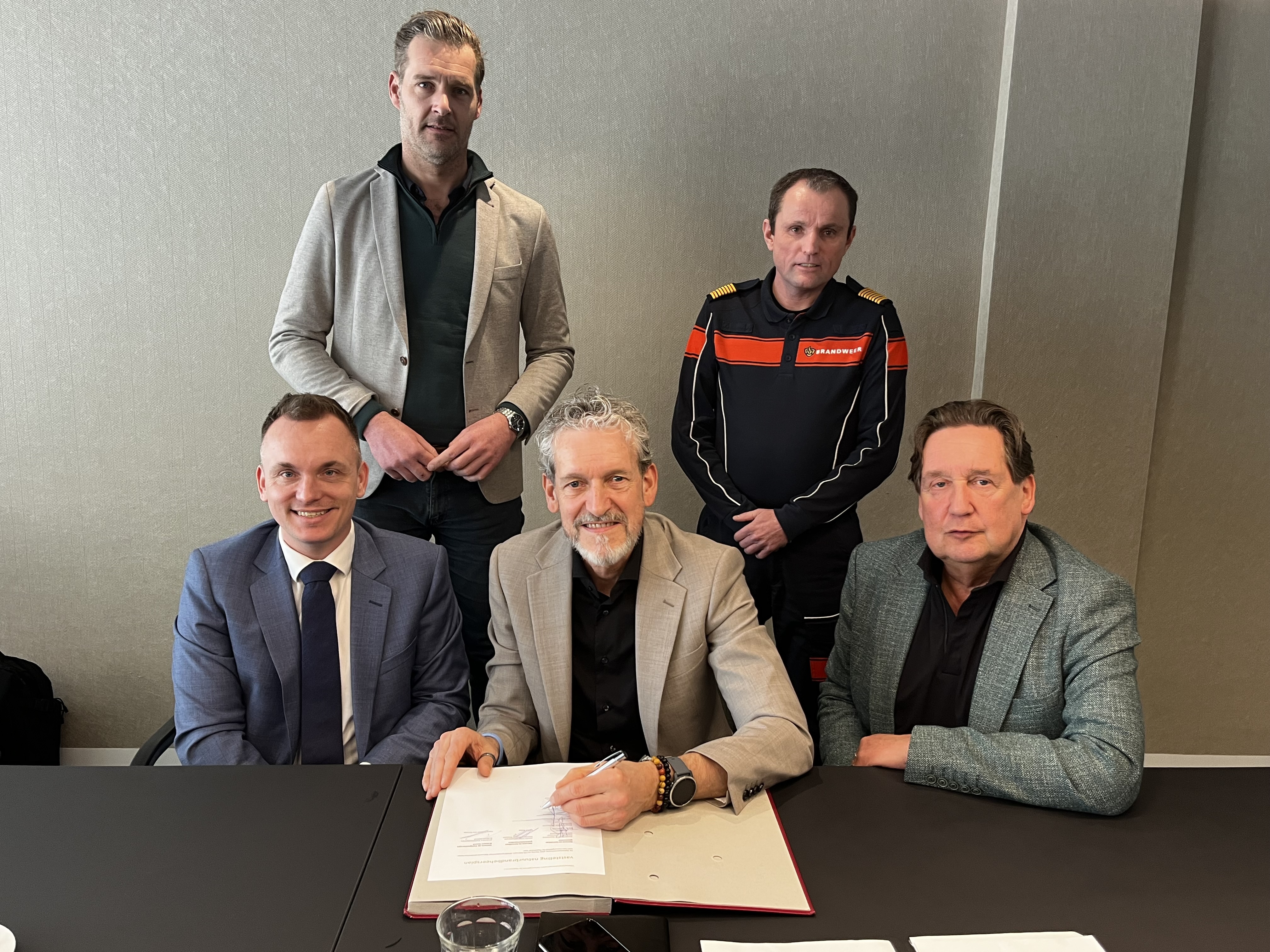 Foto van de ondertekening, ondertekenaars zijn van links naar rechts: Mark de Man (Bernheze), Freek Rebel (Staatsbosbeheer), Hans van der Pas (Maashorst) Paul de Vet (Veiligheidsregio Brabant-Noord), Dolf Warris (gemeente Oss)